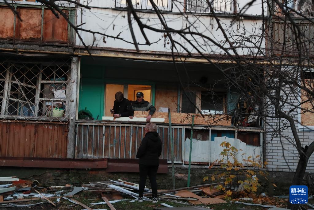 11月14日,当地居民修复加固因空袭受损的房屋乌克兰首都基辅第聂伯罗区。